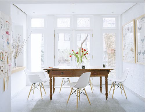 When we get our act together we hope to bring over my mum's old farm kitchen table from when she was a girl. I have in mind some nice white replica eames chairs just like the top image.